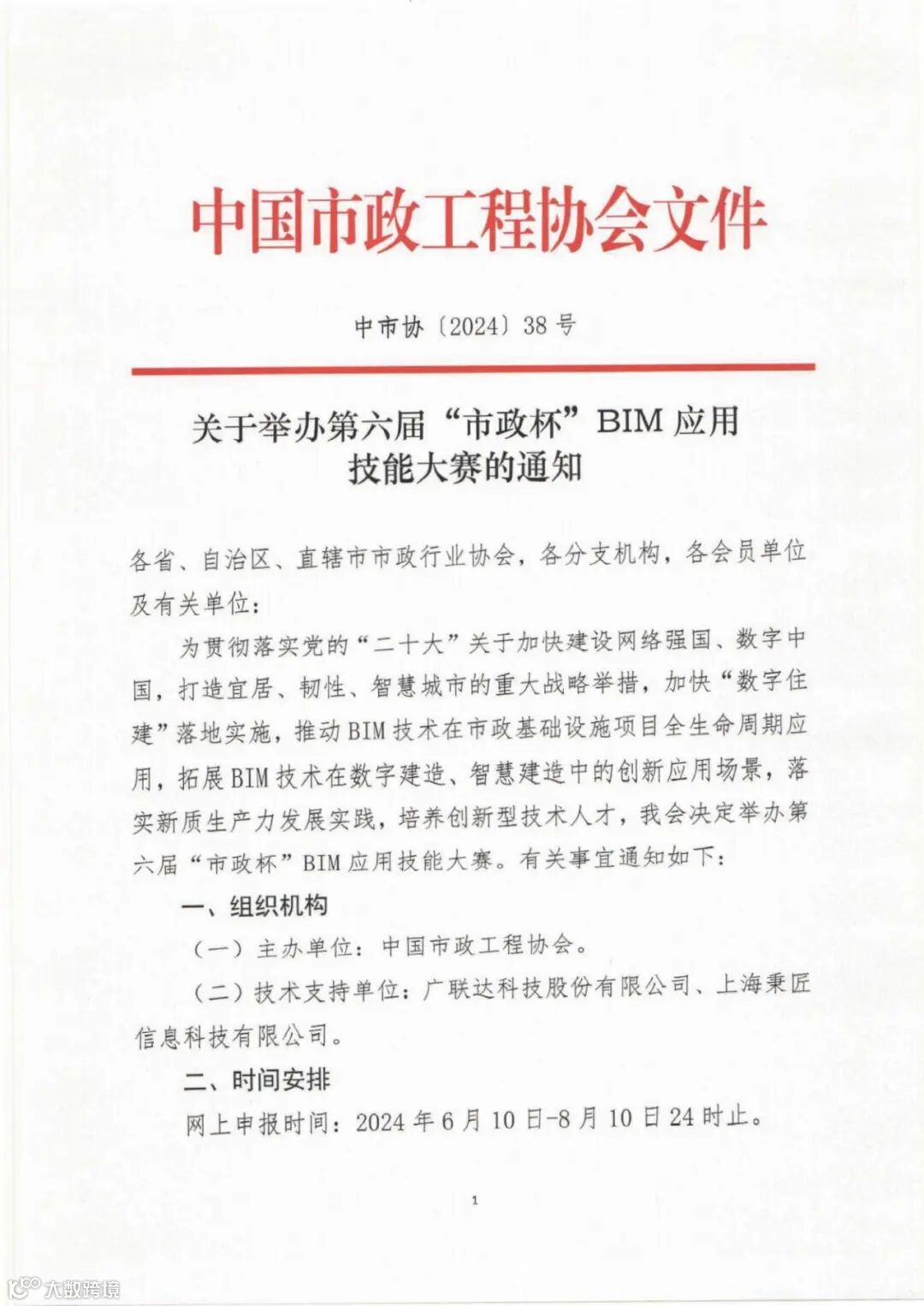 为贯彻落实党的二十大关于加快建设网络强国、数字中国,打造宜居、韧性、智慧城市的重大战略举措,加快“数字住建”落地实施,推动BIM技术在市政基础设施项目全生命周期应用,拓展BIM技术在数字建造、智慧建造中的创新应用场景,落实新质生产力发展实践,培养创新型技术人才,5月27日,中国市政工程协会发布《关于举办第六届“市政杯”BIM应用技能大赛的通知》,决定举办第六届“市政杯”BIM应用技能大赛(下称大赛)。