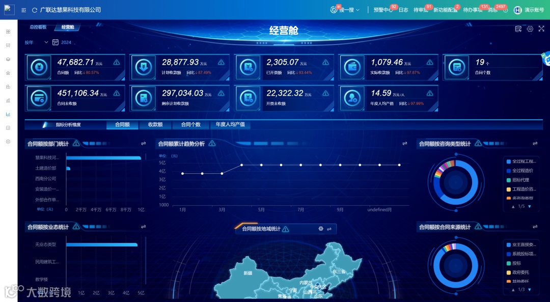 企业可以借助数字化技术实现项目&客户开源、合同履约到项目回款的经验闭环管理,有效掌控企业现金流!广联达数字新咨询平台【经营舱】功能,包含数据总看板、合同月度分析看板、项目月度分析看板等多类自定义看板系统,实现对客户回款情况的实时监控和分析,提高企业的管理效率,还能够为企业决策提供有力支持。