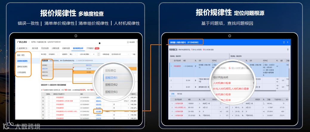 符合性检查:智能规则适配,“考点式”检查响应评标要求(包含:限价检查/清单五统一/措施项目/暂列金额/不可竞争费无缺漏项(增值税)/专业工程暂估价)