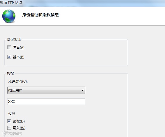 5. 点击下一步。如果电脑没有固定的外网 IP,那么身份验证选择匿名即可,授权里面选择匿名用户。如果外网有固定的 IP,为了安全起见,身份验证选择基本,允许访问里面选择指定用户。权限设置为读取。