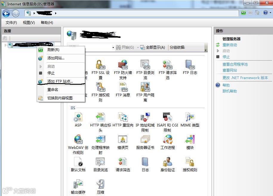 3. 点击左边那一栏,右键 - 添加 FTP 站点。FTP 站点名称可以随便起,物理路径则选择你想要在 iPhone/iPad 上访问的磁盘或文件夹。