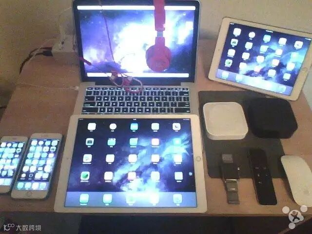 左起:iPhone 6,iPhone 6s Plus(Apple Store, 849),MacBook Pro,PowerBeats 2 Wireless,Beats Solo 2 Wireless (Amazon 199),iPad Pro (Best Buy 949),iPad Air 2,Airport Express,New Apple TV (Apple Store 199),Apple Watch,Apple TV Remote,Magic Mouse 2 (Best Buy 79),红色标注在美购买)
