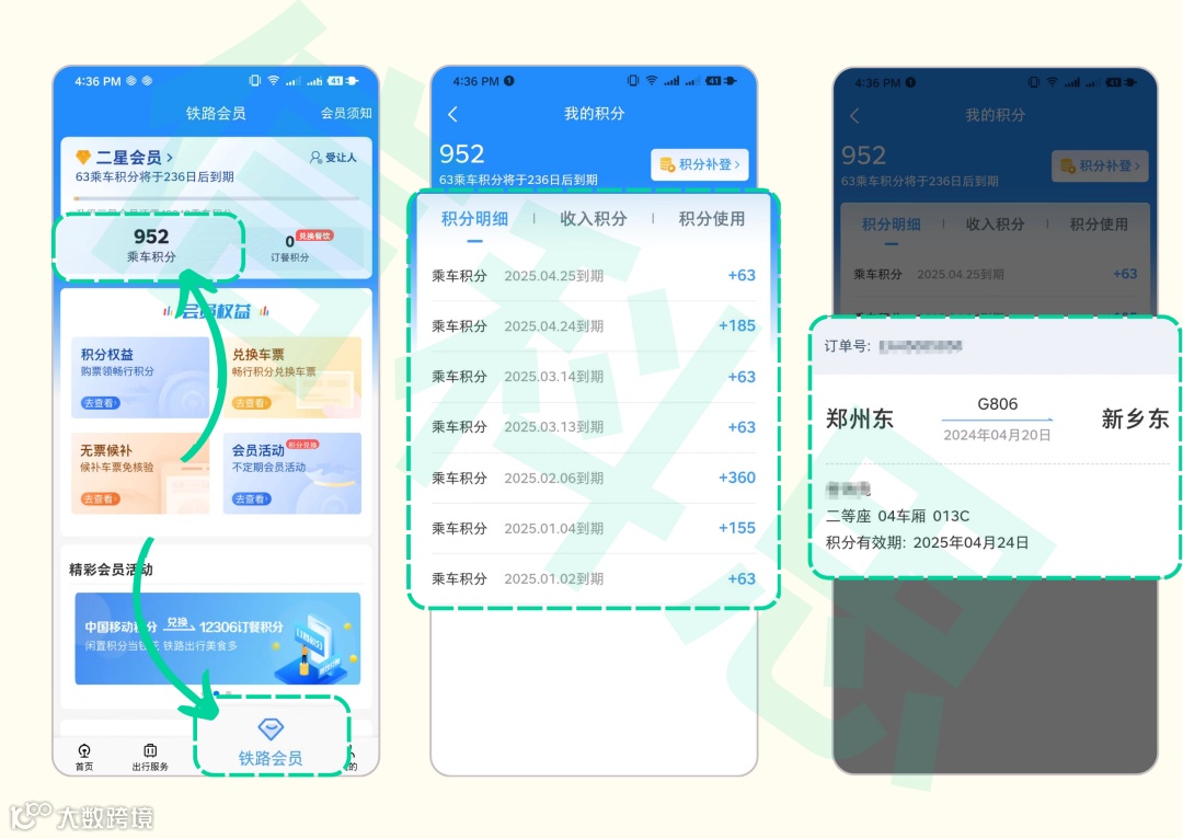 如果账号开通了铁路会员,我们可以通过每次购票所积攒的积分查询车票信息,这些积分还能用于免费兑换车票,并且是免费开通的,不要忘记开通哦。