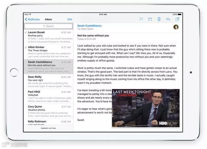 当你正在使用一款应用,这时候有一个 Facetime 视频通话进来,你可以在一个小窗口中接听这个视频通话,同时不影响到另一个应用的运行。用户在看视频过程中如果想看或回邮件,视频将以悬浮窗口的形式保留在屏幕上,大小和位置可任意调整。