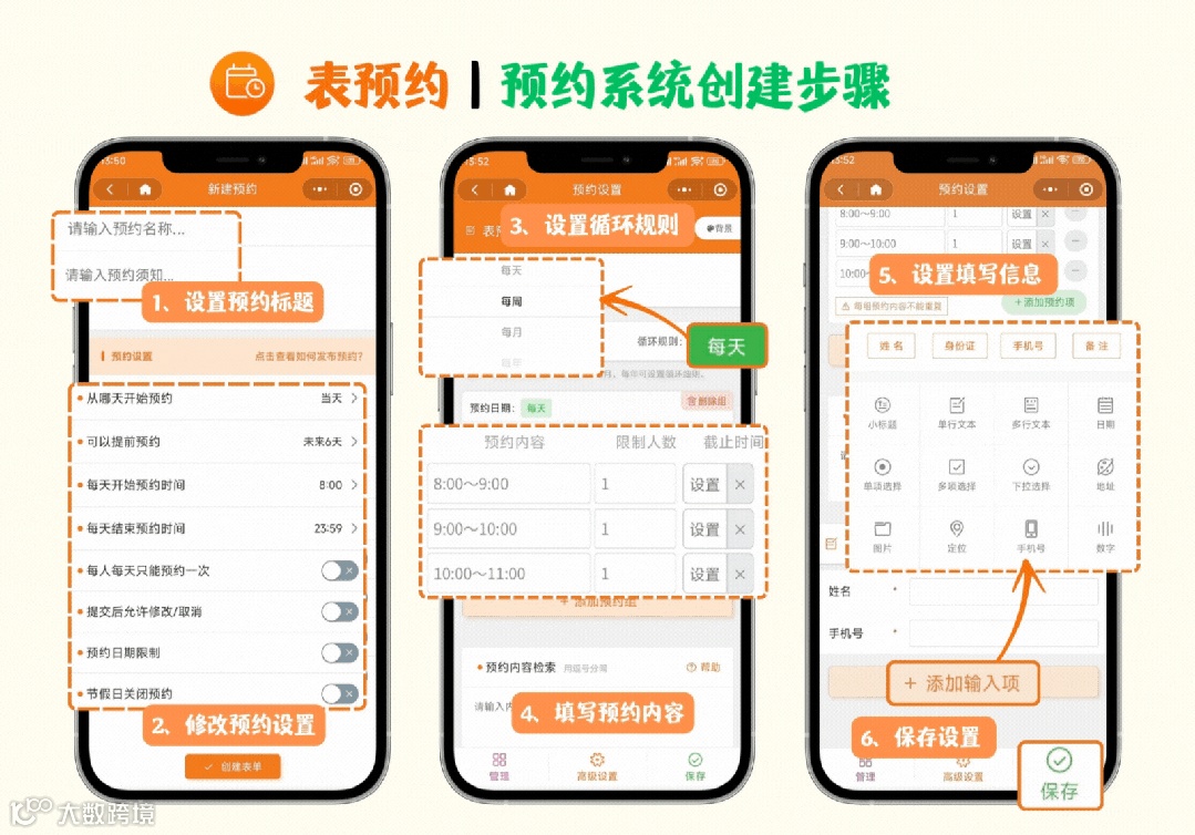 3、设置循环规则、添加预约组(可自定义预约内容和限制人数),设置预约时需填写的信息,点击保存即可完成创建。