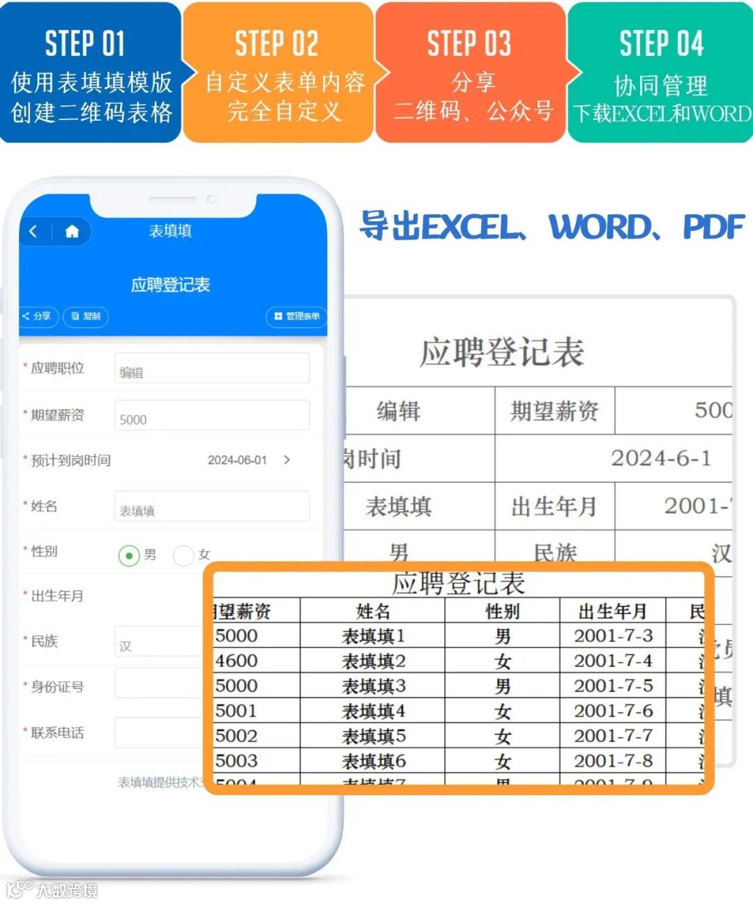 以下是应聘登记表模板,使用表填填可导出Excel、Word、PDF。