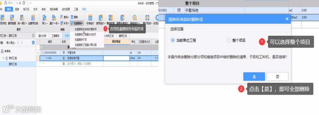 点击分部分项界面,点击批量删除,选择【删除所有临时删除项】,在弹出的对话框中选择整个项目,点击是即可。