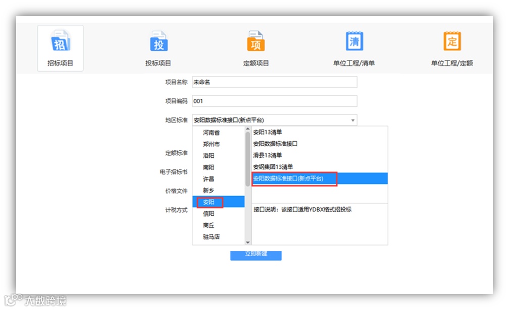 如果在安阳市公共资源交易中心新点平台上,上传招标文件或者上传投标文件,则在【地区标准】中选择:安阳--安阳数据标准接口(新点平台),该接口适用于YDBX格式招投标。