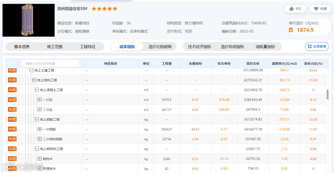 广联达指标网的出现,为我解决以上问题,通过参考行业同类型指标数据的含量指标及建面单方指标,完成招标文件的编制。文件编制完成后,应用行业数据,校验招标文件、工程量及合理性;拿地前,进行成本测算,测算时,参照外部数据进行建安部分成本编制;