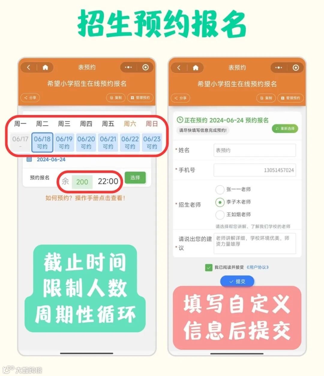 更多功能:可自定义设置限制预约报名人数、截止时间/预约时间范围/数据校验/临时关闭某个预约项等。