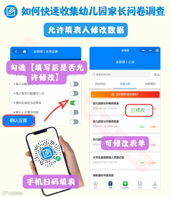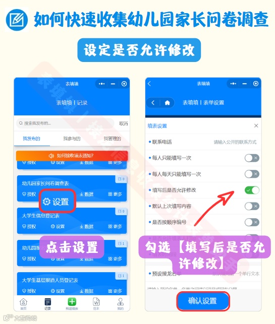 答:担心填表者手滑填错信息?你可以在表填填小程序表单中设置「微信中填表后允许填表人修改数据」,而不必让他重新填写一份新的数据。