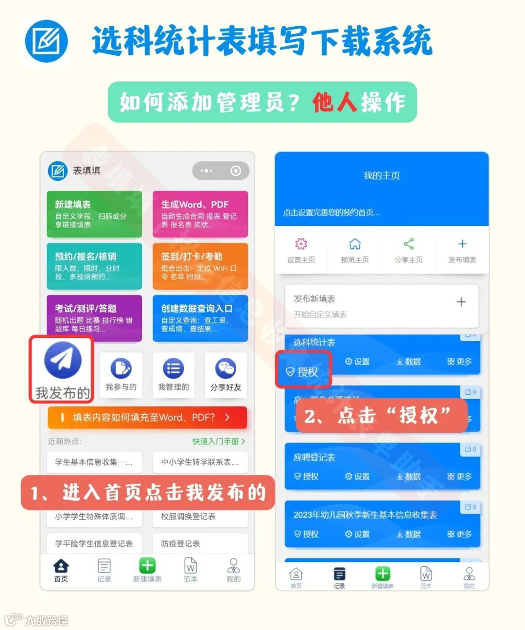 创建表单的老师进入首页,点击【我发布的】,选择自己创建的选科统计表后,点击【授权】进入授权管理,获取各班老师的授权id,再把这些id复制进授权页面中。