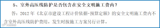 解决办法:招标单位将临时设施费组成文件拿出来,指出里面注明已包含临时供电管线的费用。投标单位不认可,将《北京市建设工程计价依据解读》拿出来,里面明确注明安全文明施工费中不包含高压线防护。最终,建设单位统一发布答疑文件,在措施项目清单增列高压线防护清单项。