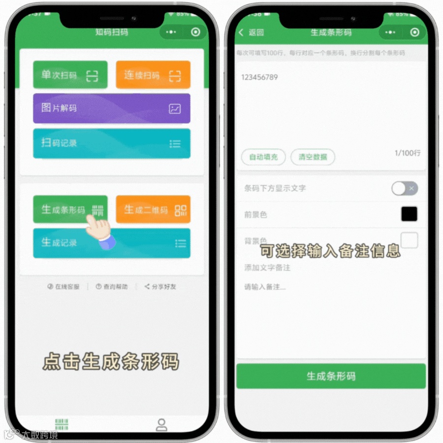在小程序首页,点击“生成条形码”功能,输入数字和字母(目前不支持中文)的条形码内容,点击“生成条形码”。生成的条形码可下载并保存至您的相册。