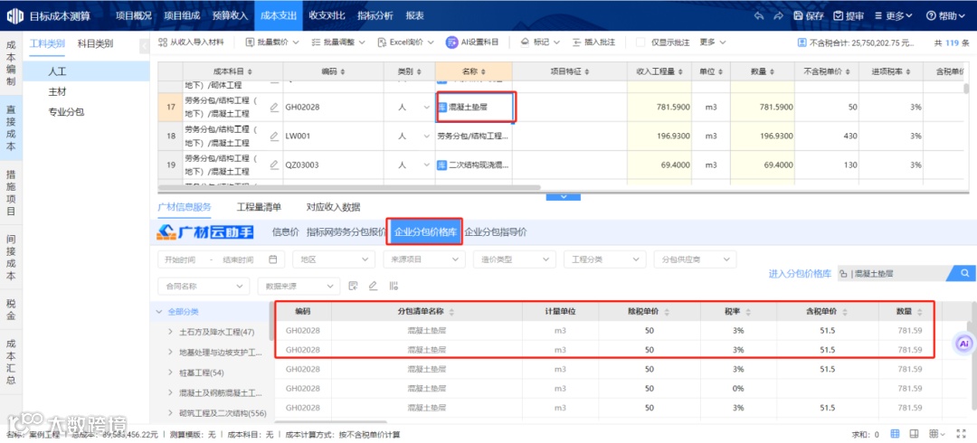 成本测算→直接成本→广材助手→材料库/分包价格库→ 推荐应用 。