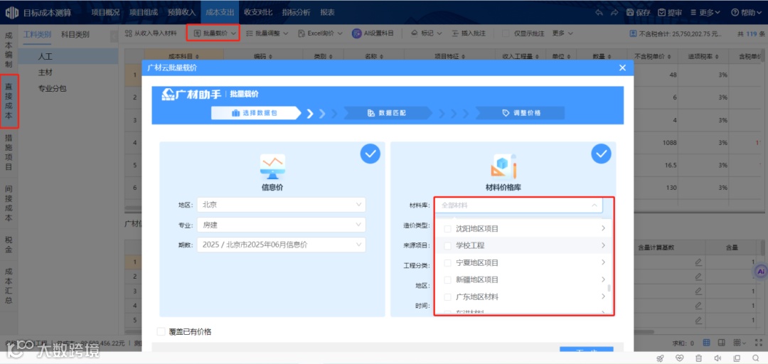 成本测算 → 直接成本 → 批量载价(分包、材料) → 选择目标价格库 → 一键完成多材料价格载入。