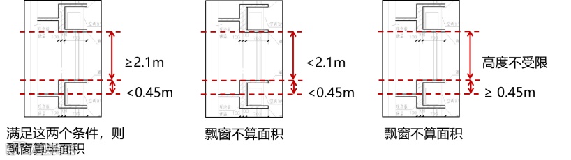 ①窗台与室内楼地面高差在0.45m以下且结构净高在2.10m及以上的凸(飘)窗,应按其围护结构外围水平面积计算1/2面积。