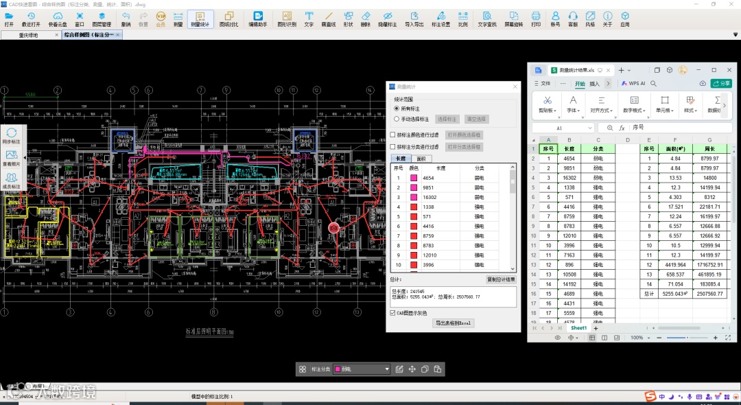 ②CAD快速看图可以一键统计测量出的长度和面积,并且按照分类进行统计,统计结果还可导出到Excel,方便后续使用。