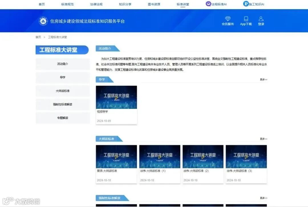 打开住房城乡建设领域法规标准知识服务平台(网址为:www.kscecs.com),点击网站首页顶部入口,即可直接进入“工程标准大讲堂”观看课程。
