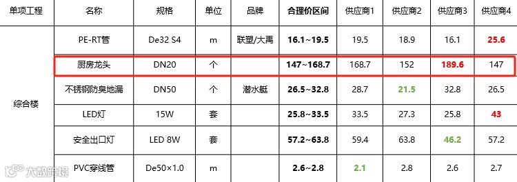 以该综合楼项目中的厨房龙头为例,四家供应商的这四个价格当中,明显能够看到供应商3的189元明显偏高,所以把它剔除出去,就可以确定合理价的区间大概锁定在147到168之间,通过这样的方式就能知道我们的合理区间在哪里。选取三个以上价格,剔除其中不合理偏高价格和偏低价格,剩余有效价格可作为合理价格区间。