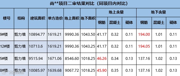 通过与指标网数据对比,9/12#地下钢筋含量偏大,需重点复核;