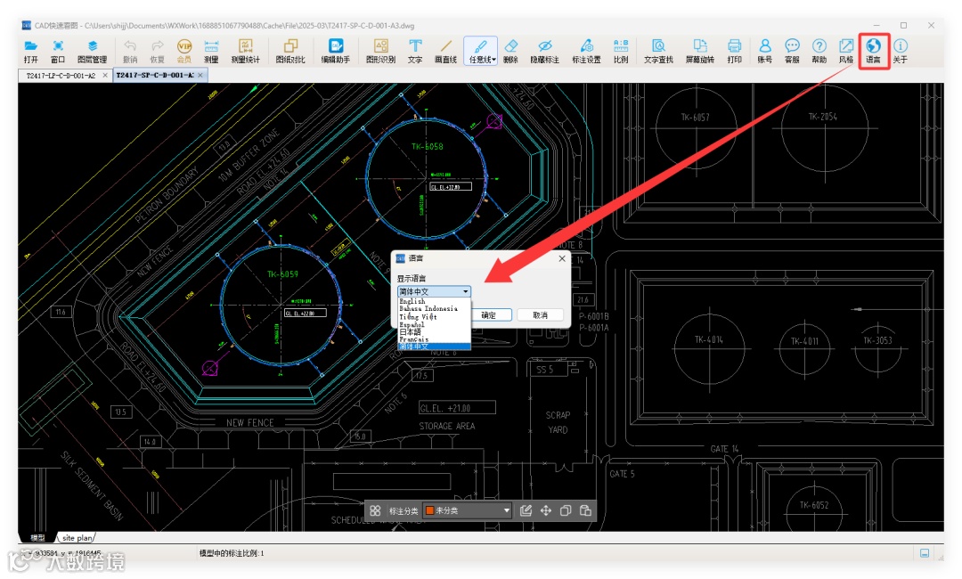 电脑端CAD快速看图国际版的工具栏右侧-语言-选择需要的语言。