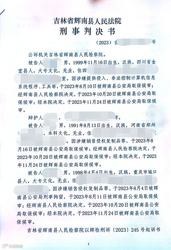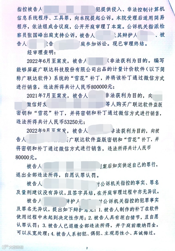 同年11月,吉林省辉南县人民法院公布刑事判决书,三名被告人以非法获利为目的,编写并出售能够屏蔽广联达科技股份有限公司出品的计量计价软件系统的“雪花”补丁,违法所得共计933250元,构成提供侵入、非法控制计算机信息系统程序、工具罪。法院生效判决结果为:三名被告人均判处有期徒刑三年,并处罚金十万元、三万元、两万元,扣押违法所得。