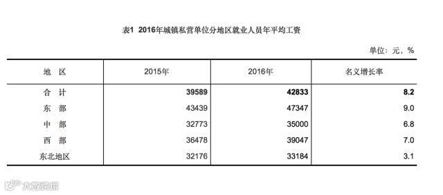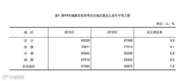 分区域来看,国家统计局公布的数据显示,2016年城镇非私营单位就业人员年平均工资由高到低依次是:东部、西部、中部和东北地区,分别为77013元、62453元、55299元和54872元,同比名义增长率由高到低依次为东部9.1%、西部9.0%、中部8.8%和东北地区7.5%。