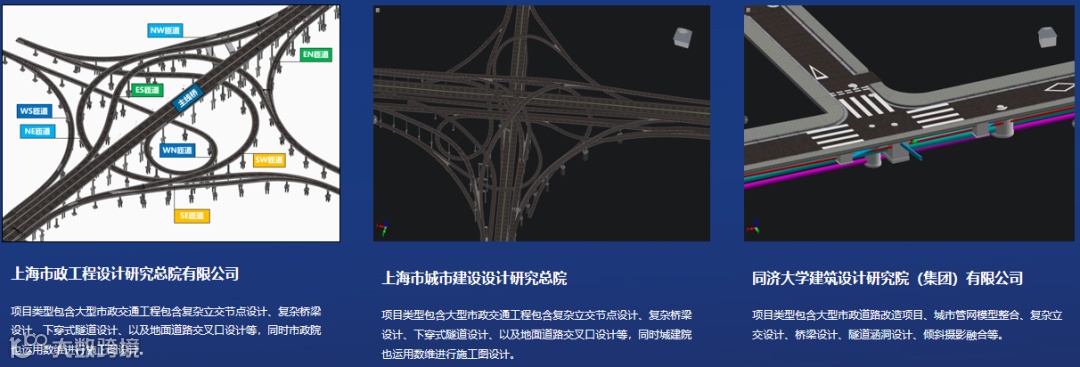 上海市政工程设计研究总院(集团)有限公司、上海市城市建设设计研究总院(集团)有限公司、同济大学建筑设计研究院(集团)有限公司等设计企业深度应用了数维道路产品,对高速公路、城市复杂立交、地面道路、下穿隧道、市域铁路、复杂桥梁以及方案施工图一体化出图等功能模块进行真实项目验证。