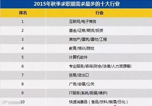 数据显示,从各行业对人才的需求量来看,互联网/电子商务行业的人才需求量最大,其次是基金/证券/期货/投资,再次是房地产/建筑/建材/工程业。 各行业对人才的需求量与各行业的发展情况密切相关,中国互联网、金融业、房地产业依然是目前发展势头最为强劲的三大行业。