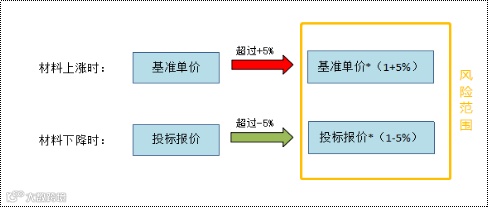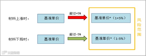 2、承包人投标报价中材料单价高于基准单价:施工期间材料单价跌幅以基准单价为基础超过合同约定的风险幅度值,或材料单价涨幅以投标报价为基础超过合同约定的风险幅度值,其超过部分按实调整。如下图所示: