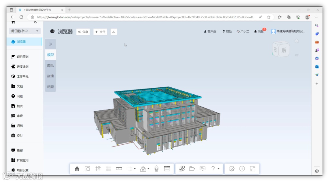 国产自主平台的BIM模型可直接用于各种建筑性能分析并输出计算书,节约了重复建模工作时间3天。项目完成后,将多专业模型在平台上自动整合,并和二维图纸进行结构化关联,以链接或账号的形式交付给业主及第三方,其他人员可以通过轻量化的浏览器查阅设计成果。