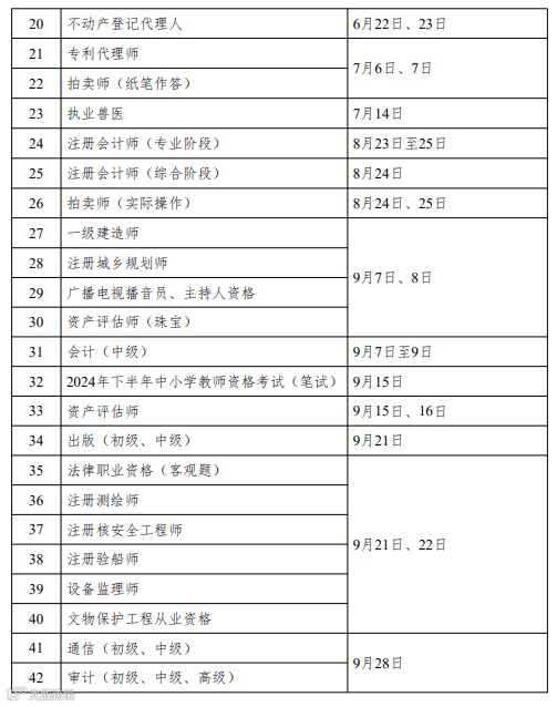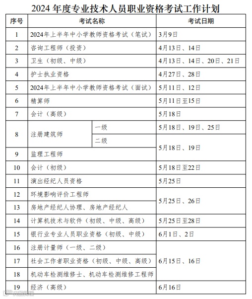 为做好专业技术人员职业资格考试规划和管理工作,便于广大专业技术人员参加职业资格考试,经商有关部门同意,现就2024年度专业技术人员职业资格考试工作计划及有关事项通知如下: