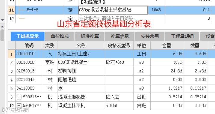 这里的主材表和辅材表是和定额分不开的,比如浇筑砼筏板基础子目。