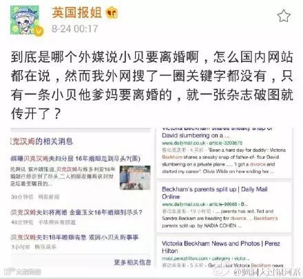 也开腔说:到底是哪个外媒说小贝要离婚啊,怎么国内网站都在说,然而我外网搜了一圈关键字都没有,只有一条小贝他爹妈要离婚的,就一张杂志破图就传开了?