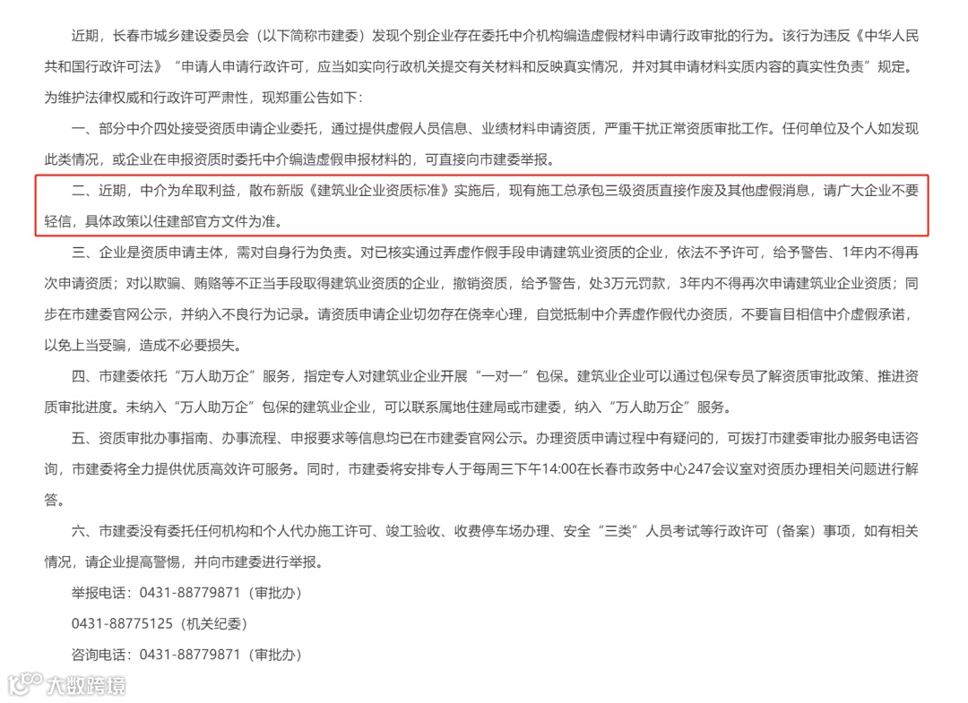 近期,中介为牟取利益,散布新版《建筑业企业资质标准》实施后,现有施工总承包三级资质直接作废及其他虚假消息,请广大企业不要轻信,具体政策以住建部官方文件为准。