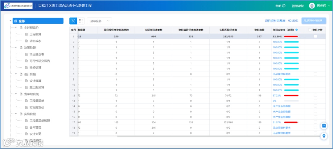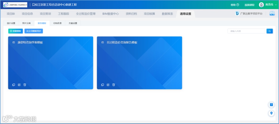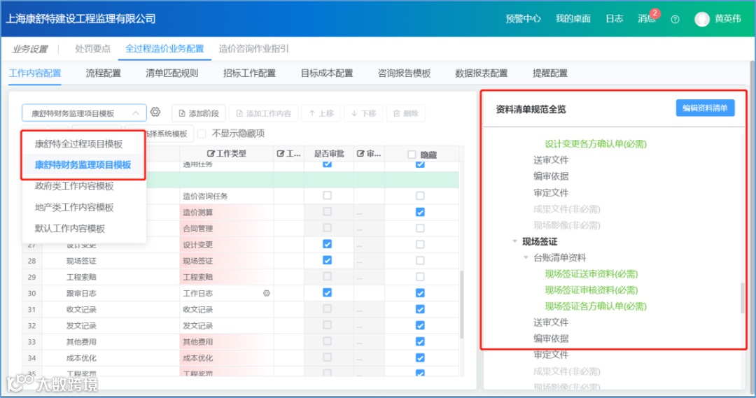 2、运用全过程造价管理平台内置模板,梳理对应项目的程序性工作内容,依据模板本地化调整。专人负责资料收集与管理,及时上传、实时更新,委托单位可实时动态监管项目。