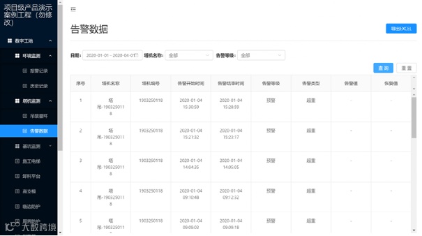 所有塔机的告警数据都会存储在系统后台,支持按时间、按塔吊、按告警等级进行筛选,并支持导出excel,导出的预警记录可作为进场人员安全教育的资料,深度发掘数据价值,提升管理水平,通过趋势做预判,做到未雨绸缪防范于未然。