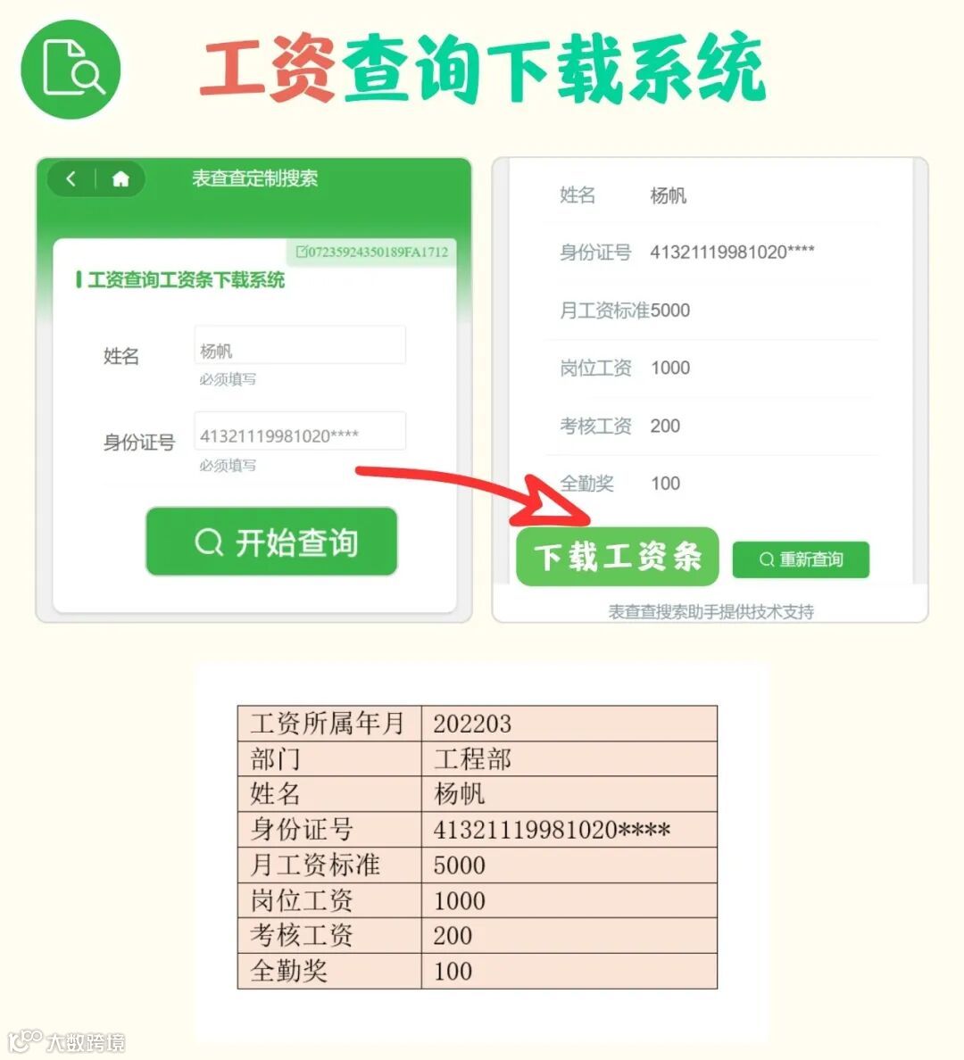 无论是工资查询、分班查询、录取查询、准考证查询、证书查询或其他查询需求,只需进入「表查查丨定制表格数据搜索助手」。公司员工可以通过扫描二维码或访问小程序链接,输入个人相关信息,即可快速查询结果,并且可以一键下载电子工资条。