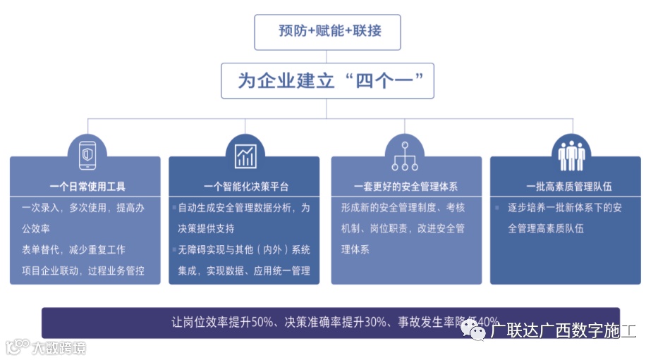 广联达安全管理系统秉承“安全第一”、“预防为主”、“综合治理”的安全管理方针,借助云、大、物、移、智等先进技术,引入科学的数字化管理模式,为施工企业建立全员可参与、现场落实效、持续有改善的智慧化安全监管体系,实现项目安全管理过程可预警、结果可分析、改进有方法。不让风险转化成隐患,不让隐患转化成事故,助力企业强化责任体系,提升治理能力,坚守安全底线,追求人、机(物)、环、企业监管的和谐统一。