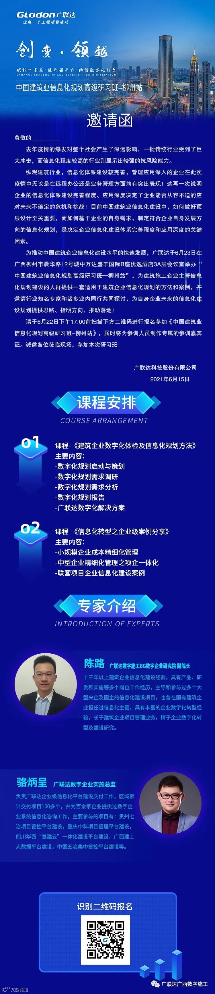 2021年,“中国建筑业信息化规划高级研习班-走进广西”第一站将于6月23日在柳州城中万达优逸酒店举办。名额有限,期待您的光临。