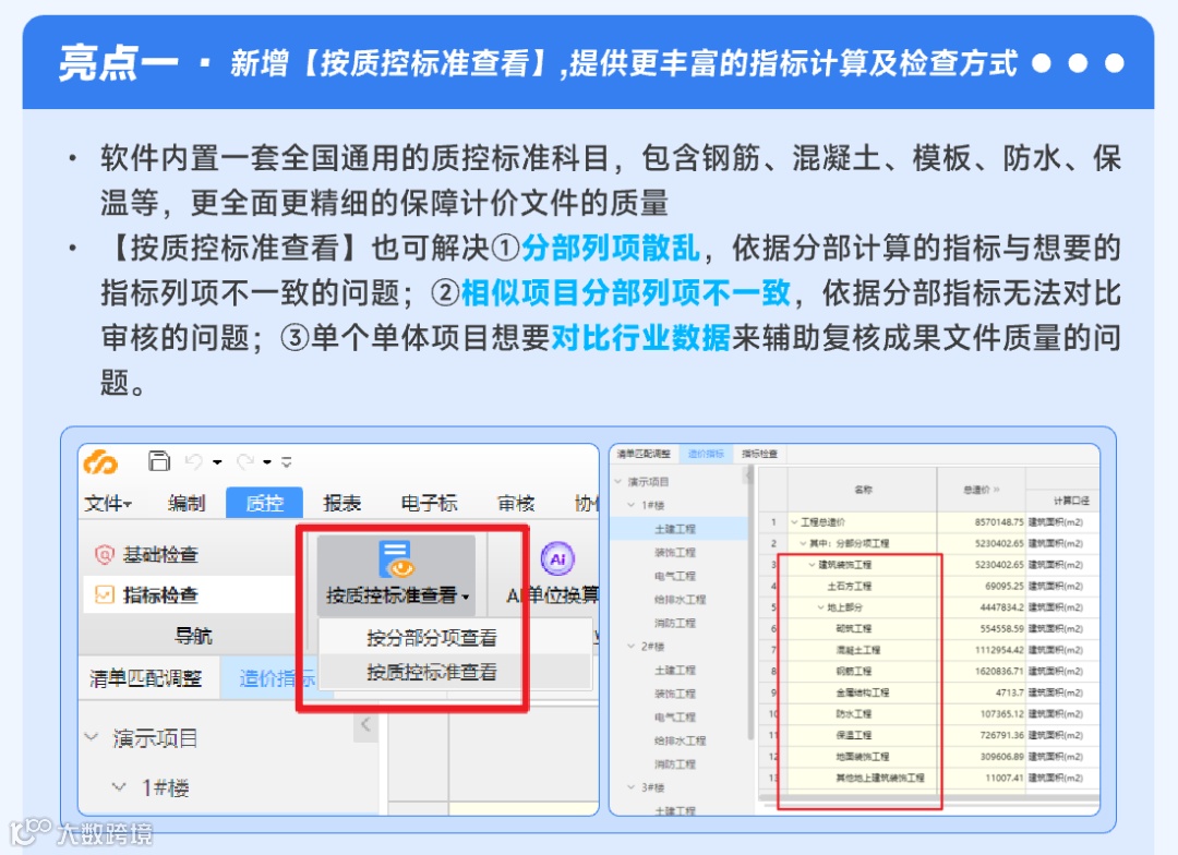 面对分项散乱不一致、相似项目无法拉通对比、行业数据辅助审核难的问题,可提供 “按分部分项查看、按质控标准查看、按行管标准查看、按企业标准查看”四种维度的指标计算方式。