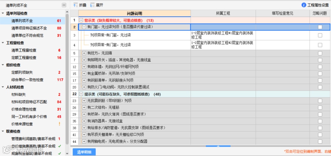 何为 “冗余”?某项目检查结果显示61项“清单列项不全”,包含精装修提示、标示标牌专业工程提示等。但项目不涉及此类专业工程,相关提示即为冗余。