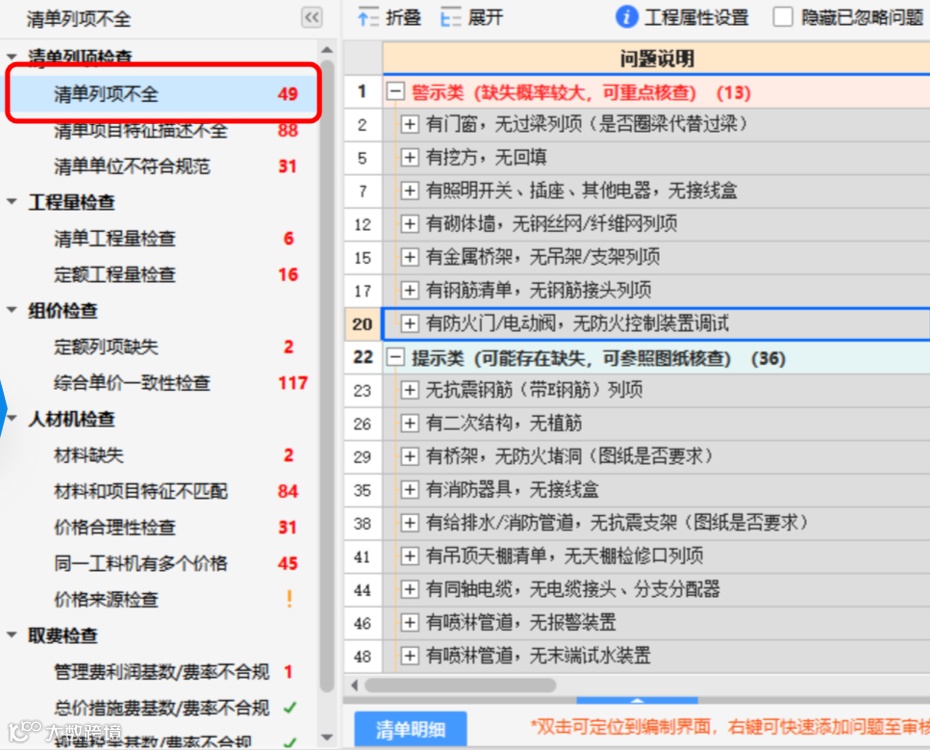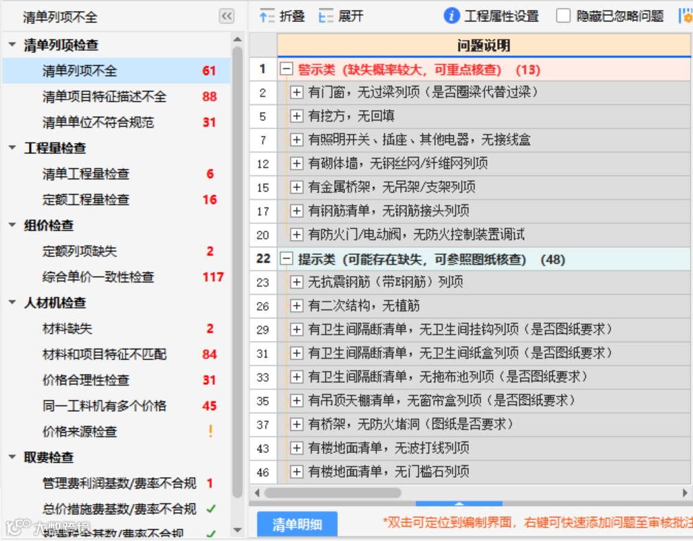 在清单列项不全检查结果里,新增“警示类”与“提示类”分类标识,进行重点区分。