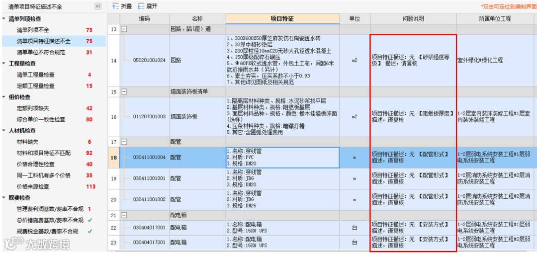 自动核查清单内关键特征值是否描述,保障清单特征描述完整性,规避特征不明确可能引发的后期争议。