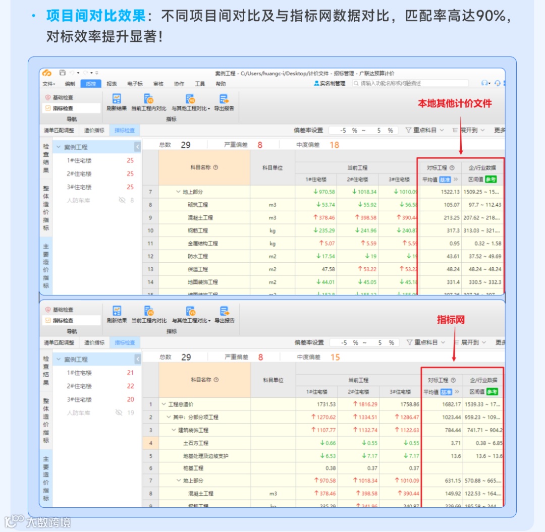 指标检查帮助覆盖更多指标计算及检查场景,助力计价文件质量审核更高效、精准,实现分项清晰化、项目对比便捷化、行业数据辅助审核实用化的价值。