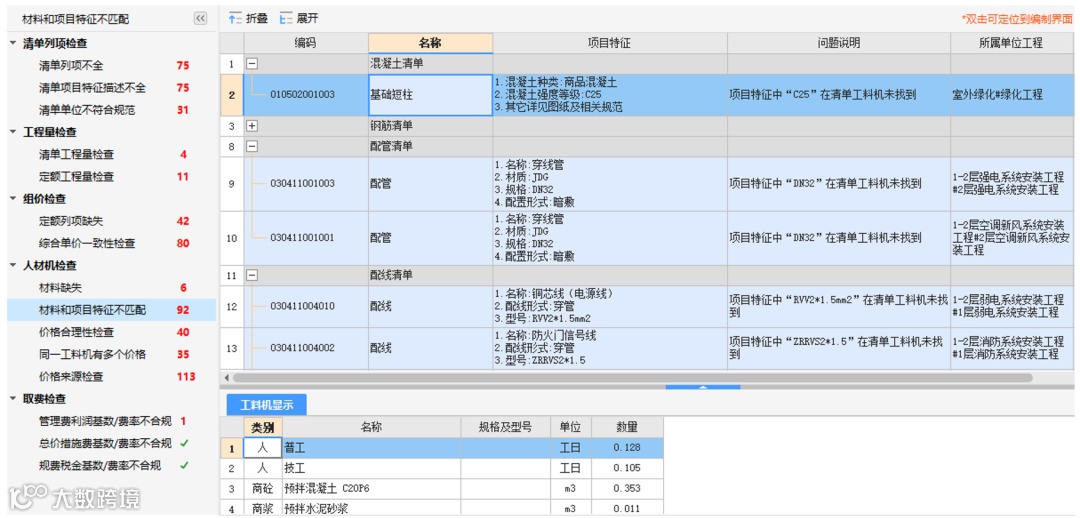 自动核查关键主材是否与特征描述中一致,保证主要材料规格正确性。