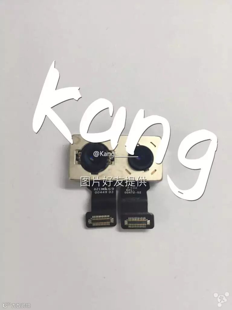 下面这张图中所显示的双摄像头模块,据微博用户 @Kang________ 称是来自之前的 iPhone 7 测试机,可以看到该模组采用的是一大一小、横向排列的两颗镜头,像素或不相同。