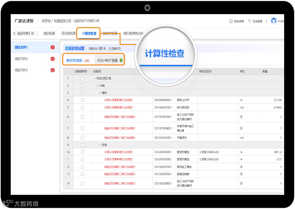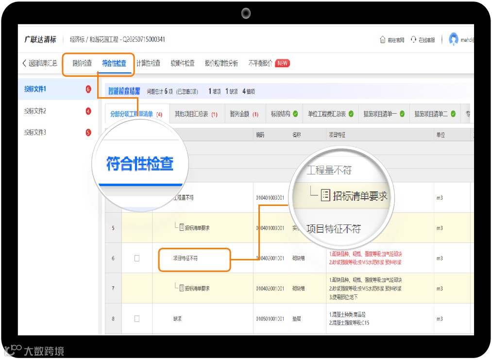 符合性检查:智能规则适配,“考点式”检查响应评标要求(包含:限价检查/清单五统一/措施项目/暂列金额/不可竞争费无缺漏项(增值税)/专业工程暂估价)