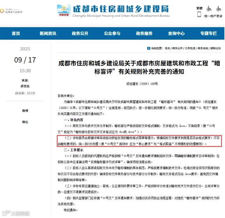 评标委员会根据评审系统自动校验发现的暗标格式异常等提示,根据招标文件要求判别是否符合格式要求;不符合暗标要求的,统一按0分处理(原“31号文”规则中 区分“核心要求”与“格式瑕疵”不同情形的处理原则)。